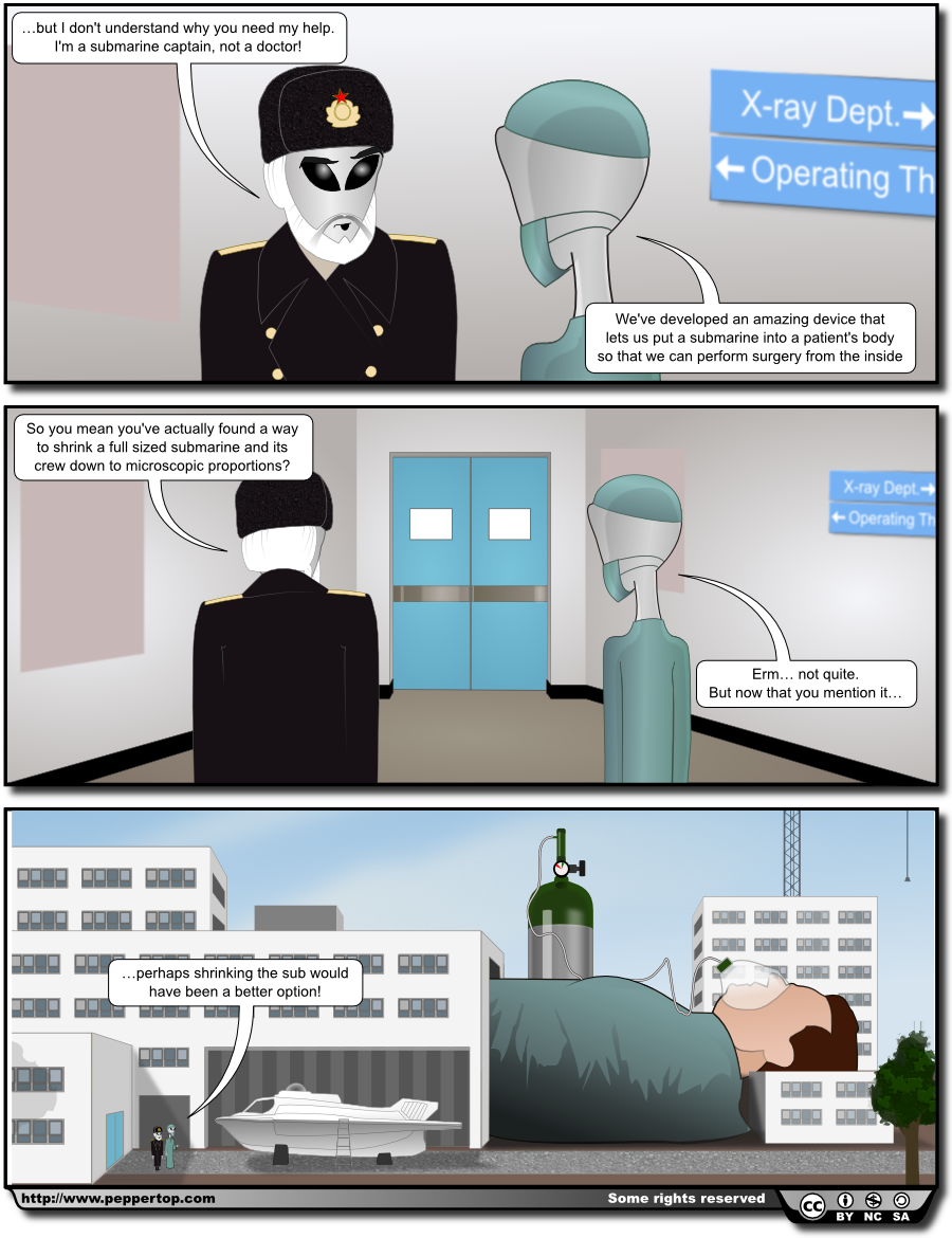 [Panel shows them standing next to a normal sized submarine, and an enormously enlarged patient]